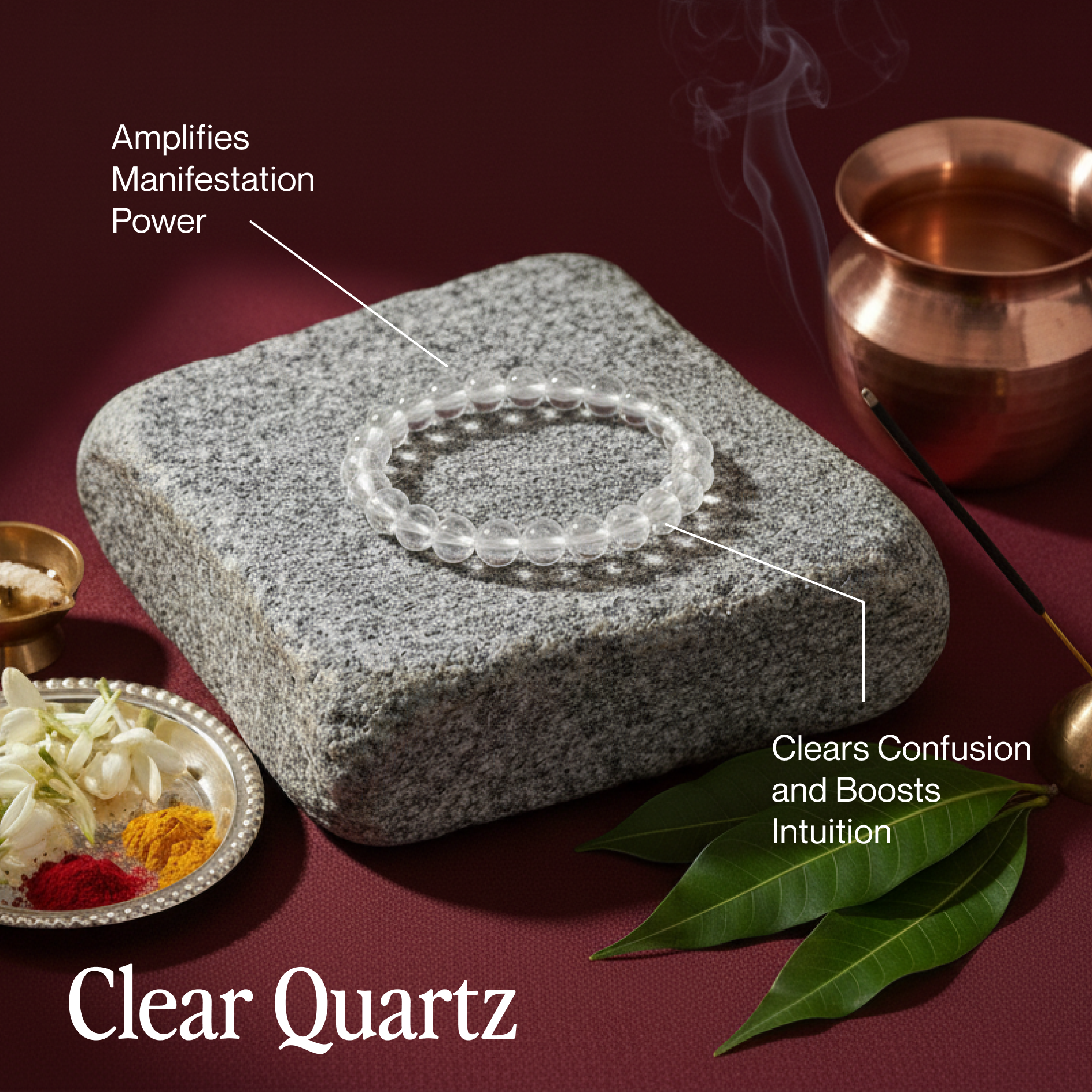 • Clear Quartz amplifies your intentions, heightens focus, and strengthens intuition.