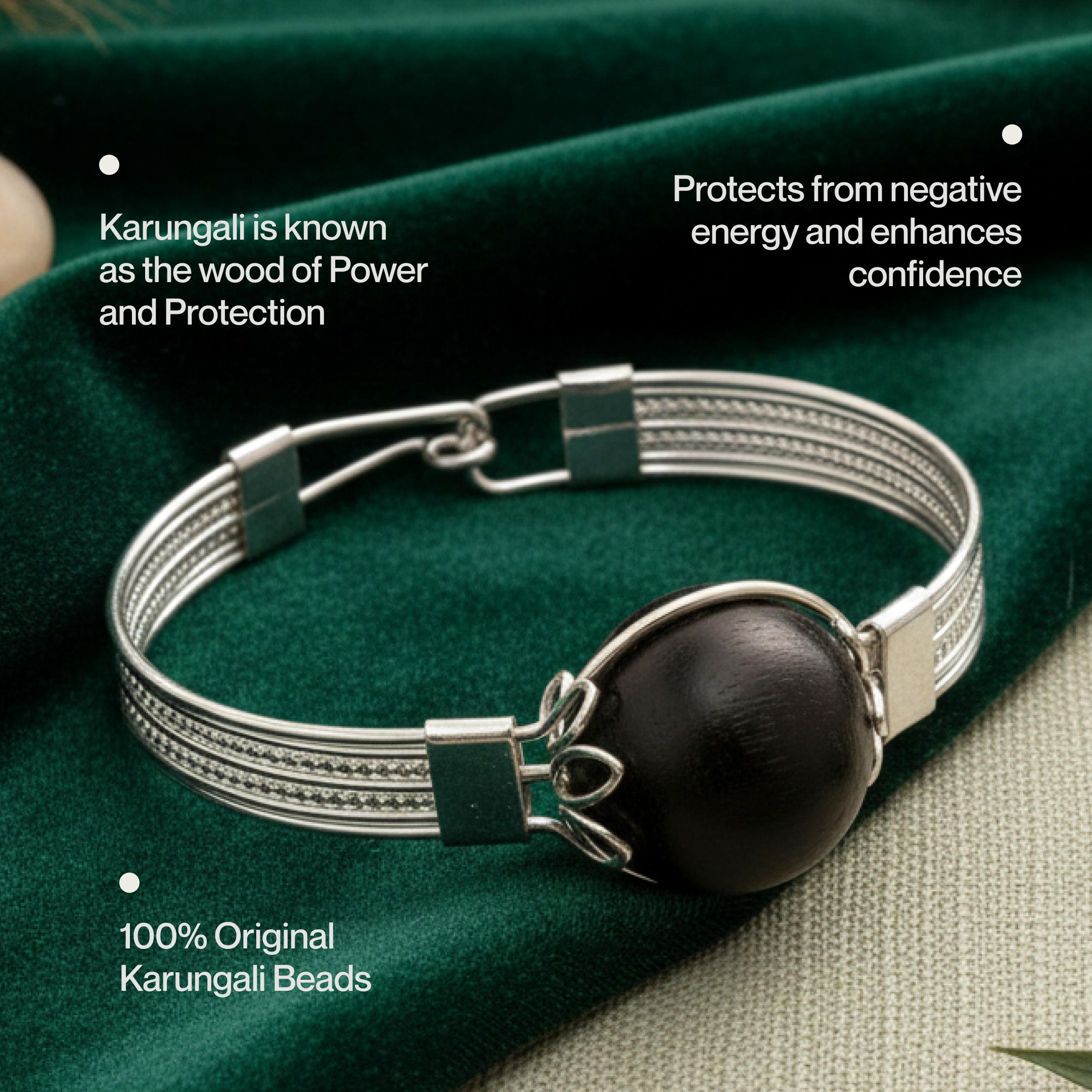 This bracelet features a premium Karungali (Ebony) bead, traditionally revered for its powerful grounding and protective properties. Karungali is believed to absorb negative energies, promote mental stability, and support inner calm. The bead is securely set within a silver bracelet, creating a minimalist design that blends spiritual significance with contemporary elegance.