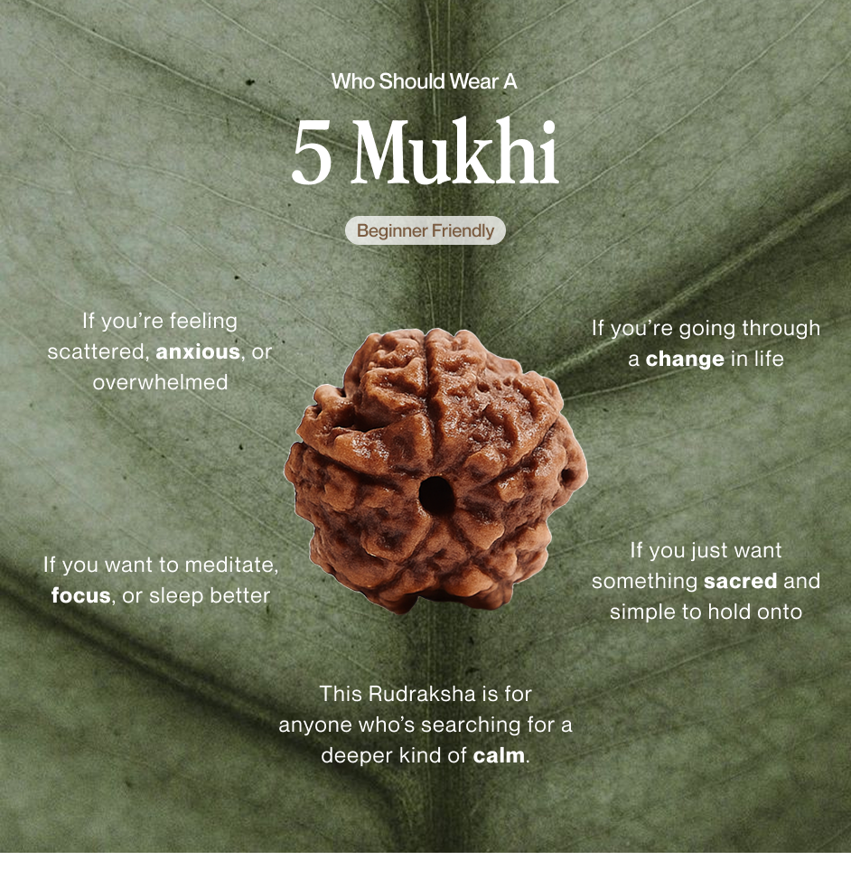 The 5 Mukhi Rudraksha is the most sacred and universally worn bead, blessed by Lord Kalagni Rudra – a fierce yet benevolent form of Shiva.
