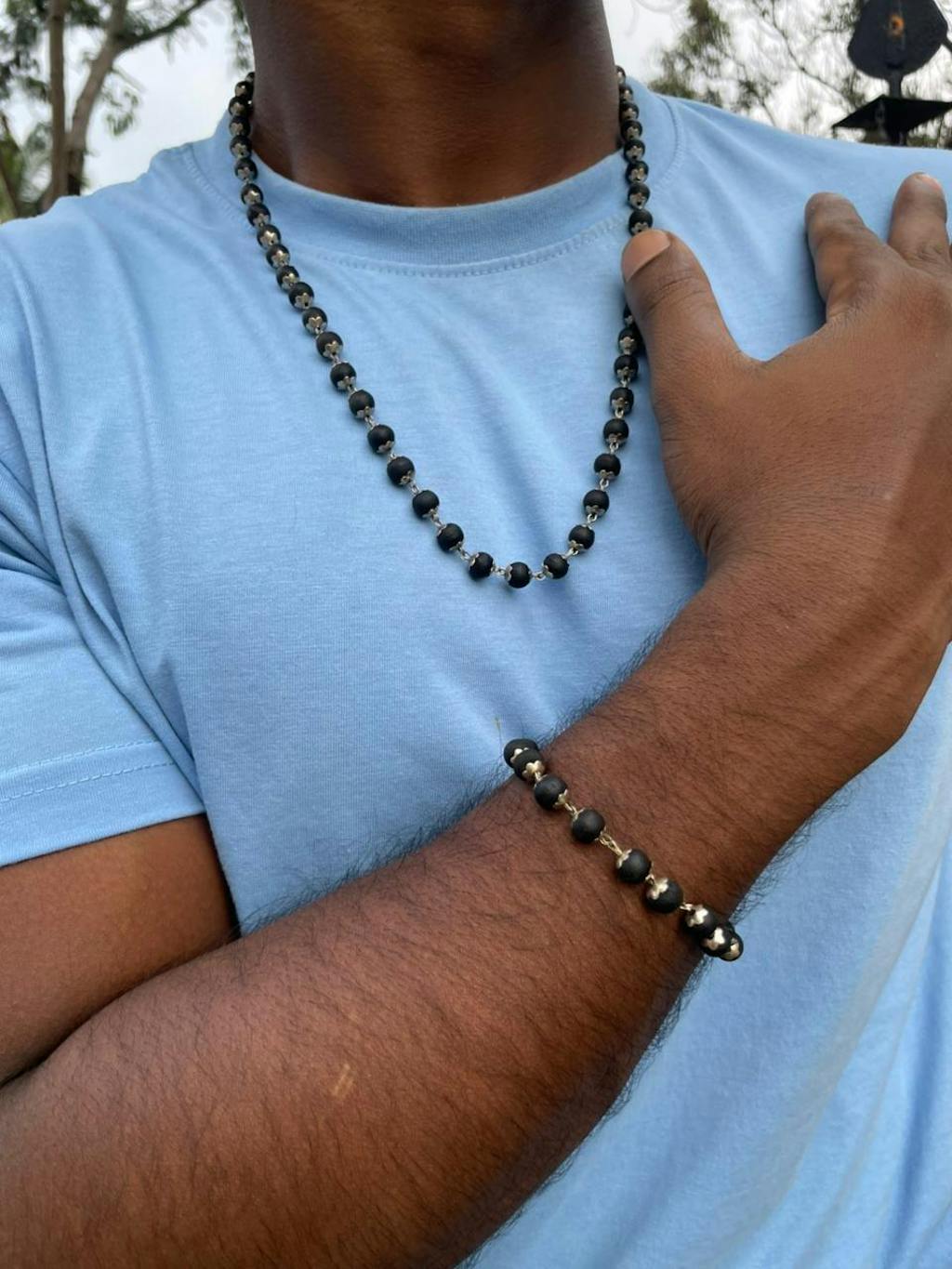 For centuries, Karungali wood has been venerated for its ability to absorb and transmute negative energy. It is believed to protect against harmful vibrations, evil influences, and the Nazar (evil eye), restoring peace and balance within the mind and body. When combined with silver, known for its cleansing and protective properties, this duo becomes a potent spiritual shield. The mala and bracelet work in harmony — the mala enhancing your meditation and inner stillness, while the bracelet serves as a daily guardian of your energy and intention.