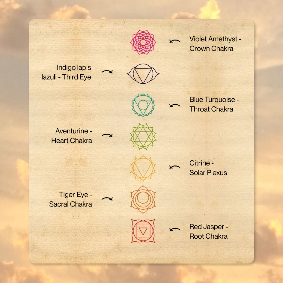 Each crystal corresponds to different chakras. For example, Amethyst calms the Crown Chakra, while Citrine energizes the Solar Plexus. Wearing them helps clear blockages and enhance your inner flow.